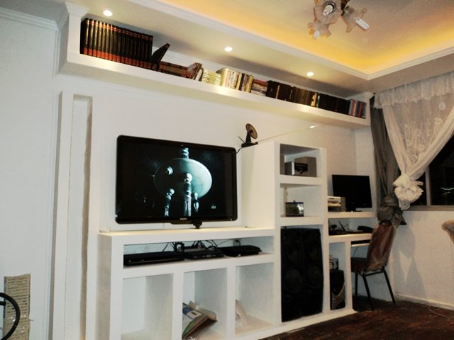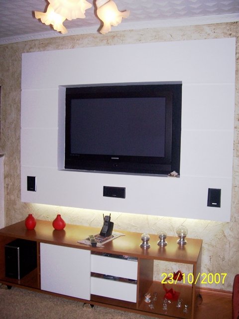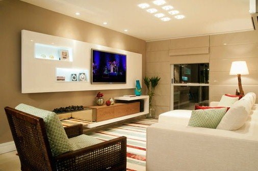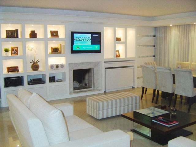 Devido ao custo ser bem inferior ao móvel de madeira, os painéis de gesso estão ganhando cada vez mais espaço na decoração das salas de tv. Com ele você pode ocultar os fios dos aparelhos eletrônicos e brincar com a iluminação indireta. Combinados com os nichos facilita a organização de objetos de decoração, além de deixar sua sala moderna e elegante. |